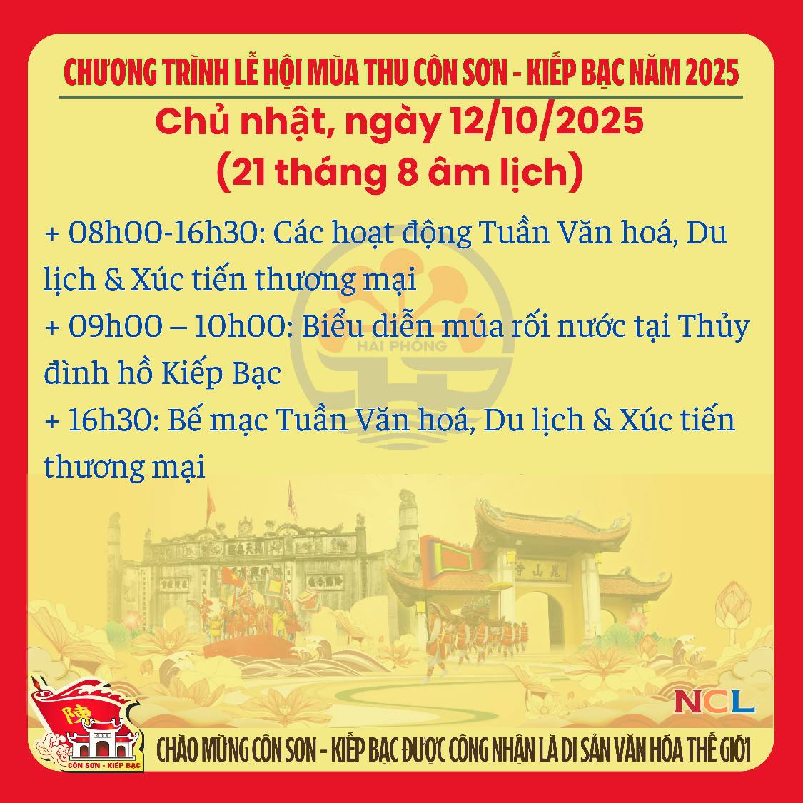 Lễ hội mùa Thu Côn Sơn – Kiếp Bạc năm 2025 sẽ diễn ra từ 1/10 đến 12/10/2025 (tức mùng 10 – 21 tháng 8 âm lịch). Đây là dịp tưởng niệm 725 năm ngày mất của Anh hùng dân tộc Trần Hưng Đạo và 583 năm ngày mất của Danh nhân văn hóa thế giới Nguyễn Trãi, đồng thời công bố các giá trị nổi bật toàn cầu của Quần thể di tích, danh thắng Yên Tử – Vĩnh Nghiêm – Côn Sơn, Kiếp Bạc vừa được UNESCO ghi danh là Di sản văn hóa thế giới.